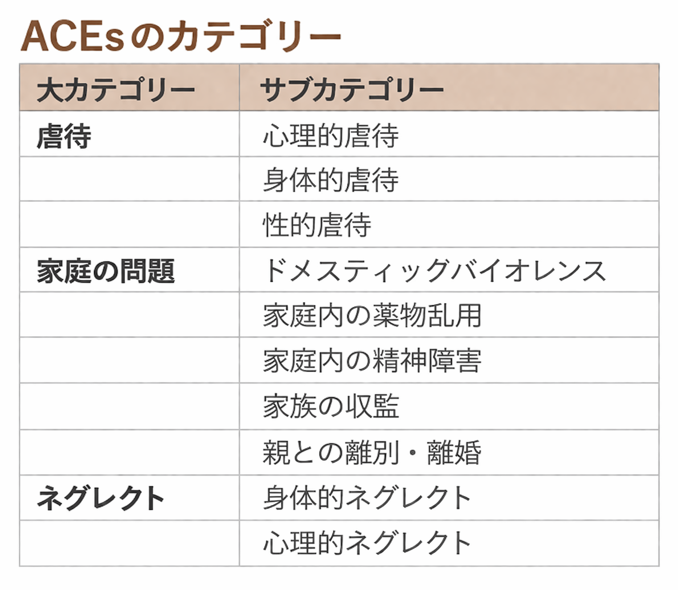 ACEsとは、0〜17歳のあいだに経験する、心や体に深刻な影響を与えうるつらい出来事のことを指します(表を参照)。たとえば、虐待やネグレクトといった直接的な被害だけでなく、家庭内での暴力、親のこころの不調やアルコール・薬物の問題など、たとえ命には直接関わらなくても子どもが安心して過ごすことを難しくする環境も含まれます。つまりACEsは、「特定の深刻な出来事」だけではなく、子どもの生活を取り巻く慢性的なストレスも含めた、広い意味での逆境的な体験をとらえる考え方です。
